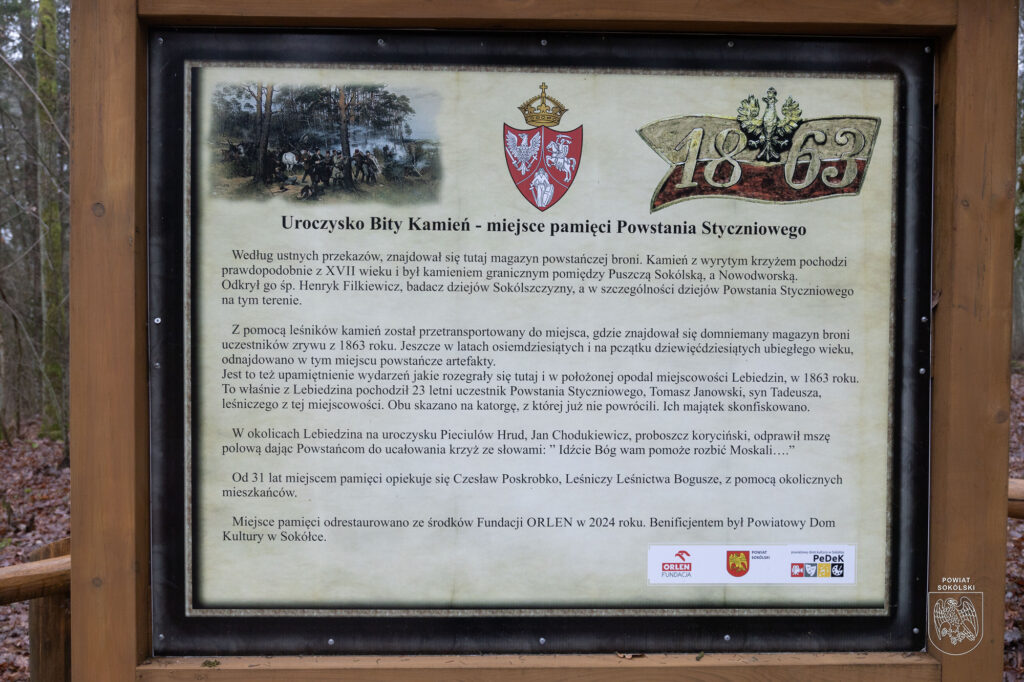 Ostatnim przystankiem tegorocznego rajdu był „Bity Kamień” – miejsce o wyjątkowym znaczeniu historycznym, otoczone opieką przez Czesława Poskrobko, Leśniczego Leśnictwa Bogusze, który od 32 lat dba o jego zachowanie przy wsparciu okolicznych mieszkańców. To tutaj, według przekazów, znajdował się magazyn broni powstańczej, a także rozegrały się ważne wydarzenia związane z Powstaniem Styczniowym, zarówno w tym miejscu, jak i w pobliskiej miejscowości Lebiedzin w 1863 roku.